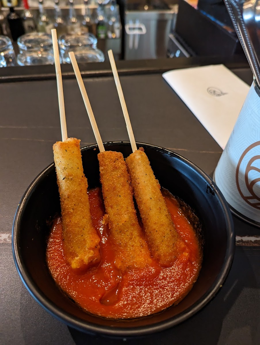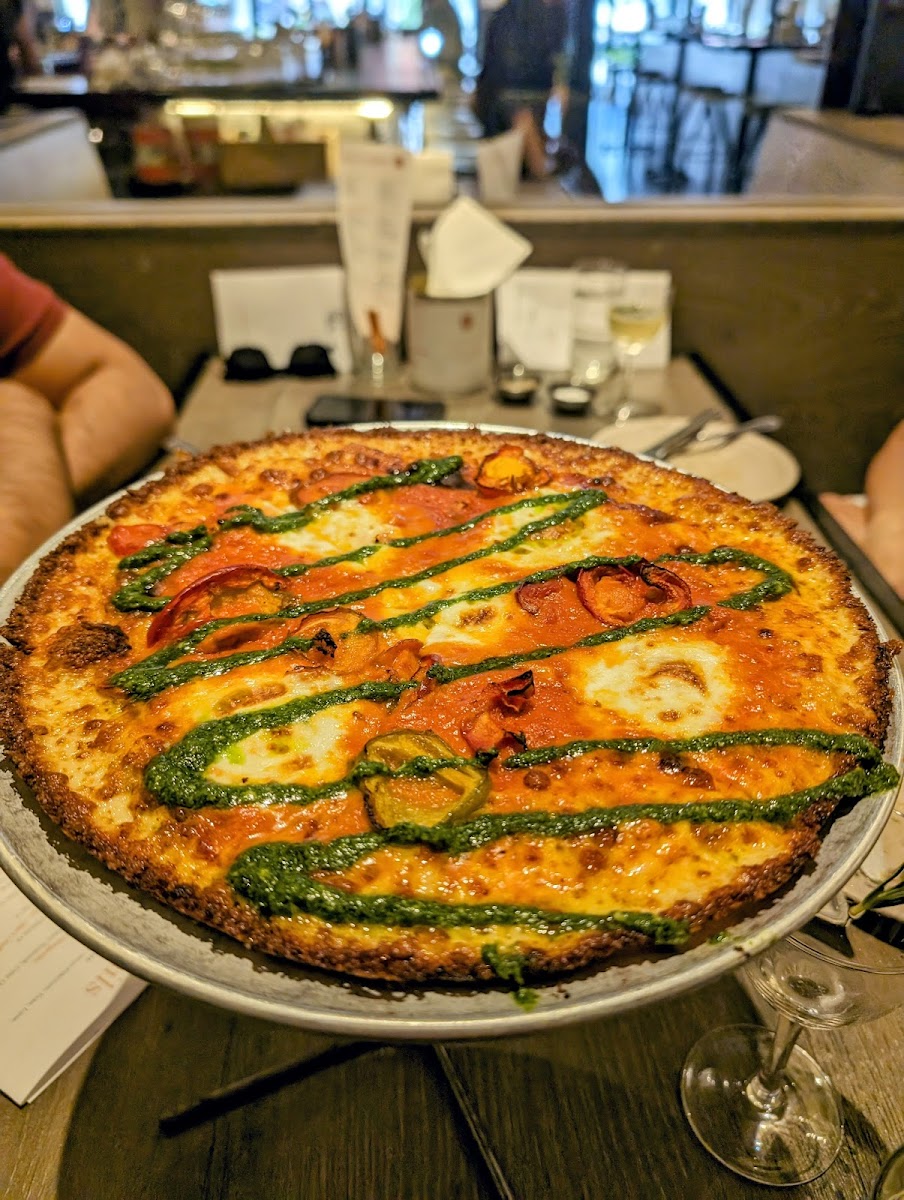 Had been hearing a lot about Sparrow so we had to go and check it out. It's a pizza bar with plenty of other options, nice bar area as well. They divide the restaurant into two area, the bar and another section of the place with booths and tables. For an app we opted for the mozzarella sticks. They brought meatballs out by accident and let us keep them so bonus review. The meatballs were super tasty, definitely homemade and had light sauce for them, would get them again. The mozzarella sticks came out on a stick, cool presentation, dipped in marinara, also very good. Now to the pizza, it's very similar to Colony. SUPER THIN style pizza with some crunch, I'd give it the nod over Colony. I got the H.O.P. Pizza which was made with Calabrian Chili Oil. It was different, wish it was a little spicier but still very good. My wife got the Ruby, recommended by our server. Came with some no nut Pesto and vodka sauce, she enjoyed it.